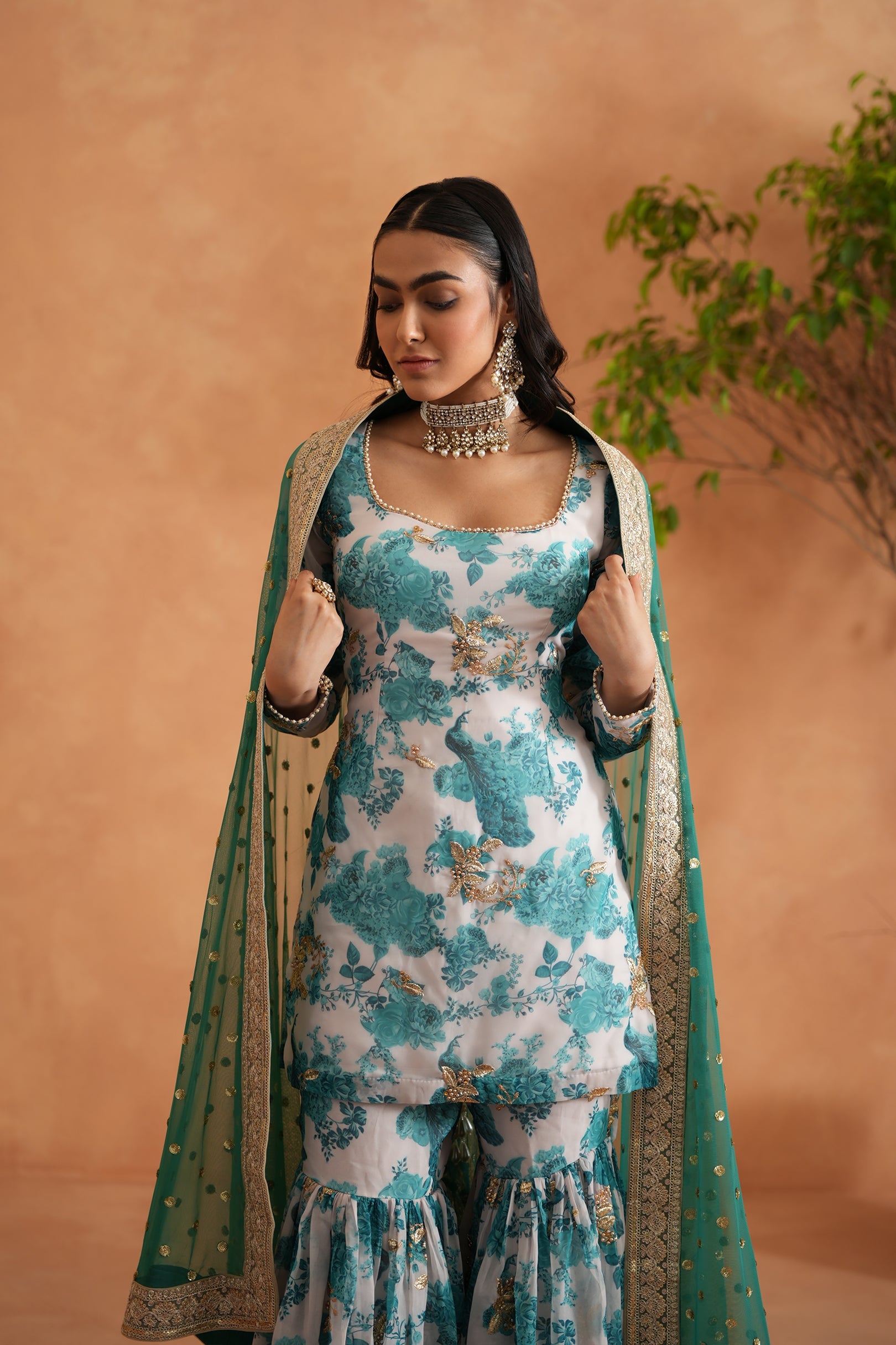 Deepika Chadha's stunning teal blue and white georgette fabric kurti, with beautiful peacock and floral prints and flowy printed garara gives a sophisticated look. It is paired with the embroidered sequins soft net dupatta embellished with beautiful borders add a beautiful look to it and keeps you light and comfortable all day long and is perfect for wedding and festive season.